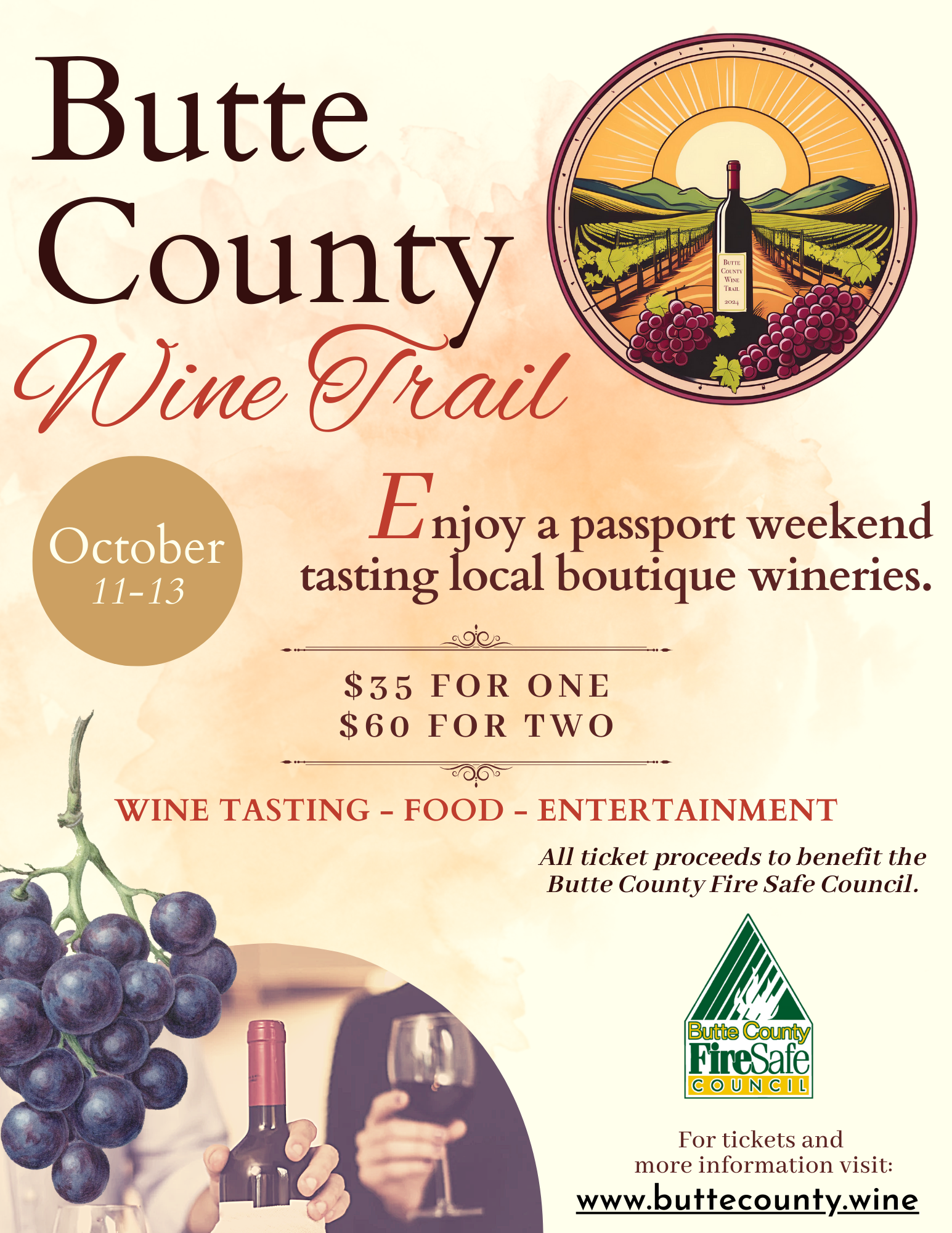$35The Butte County Fire Safe Council is thankful to be the beneficiary of funds raised through this year’s Butte County Wine Trail. Tickets are $35 each or $60 per couple. All ticket proceeds benefit Butte County Fire Safe Council.