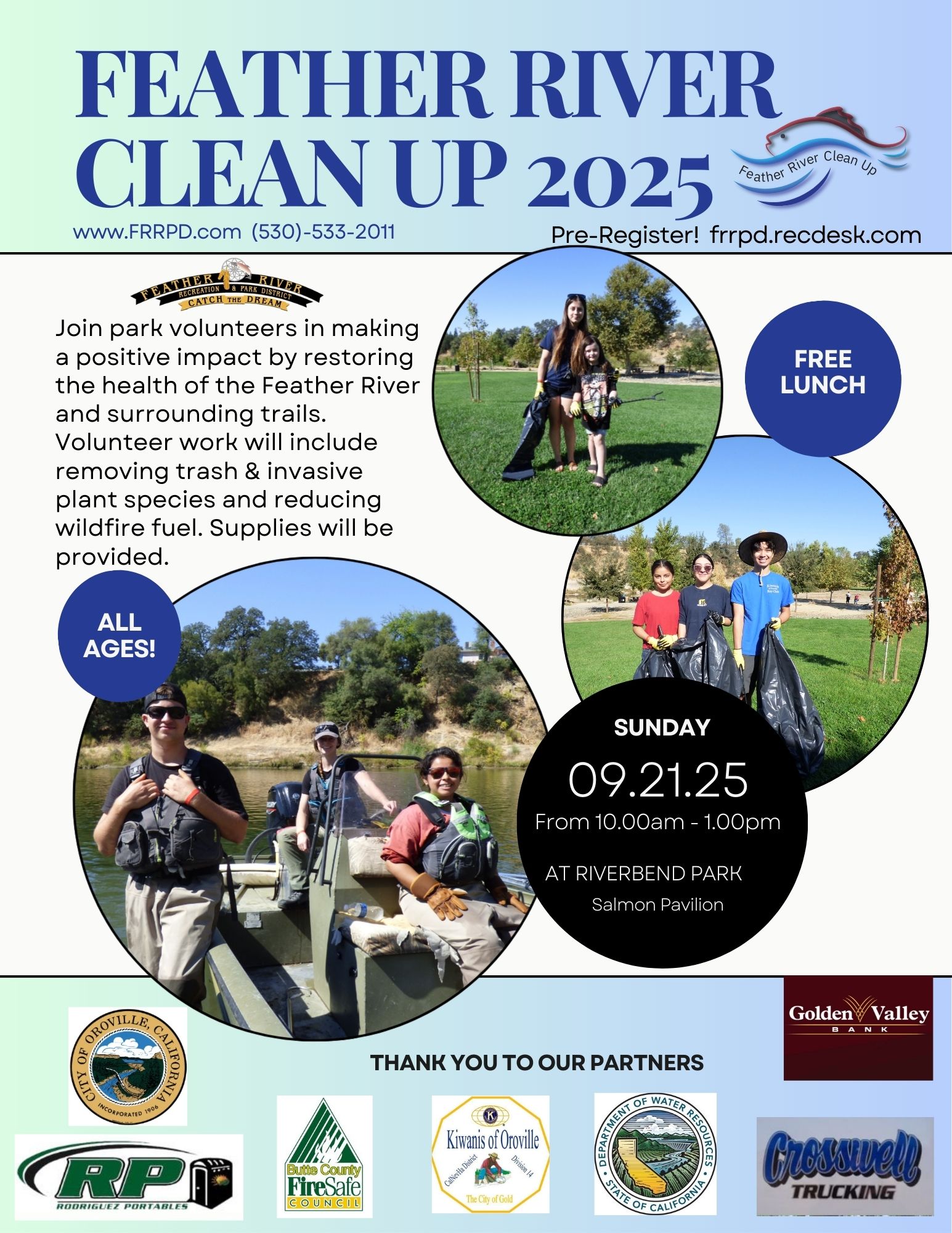 This event is hosted by the Feather River Recreation & Park District with support from our partners: City of Oroville, Butte County Fire Safe Council, Kiwanis of Oroville, California Department of Water Resources, Rodriguez Portables, Crosswell Trucking, and Golden Valley Bank.
