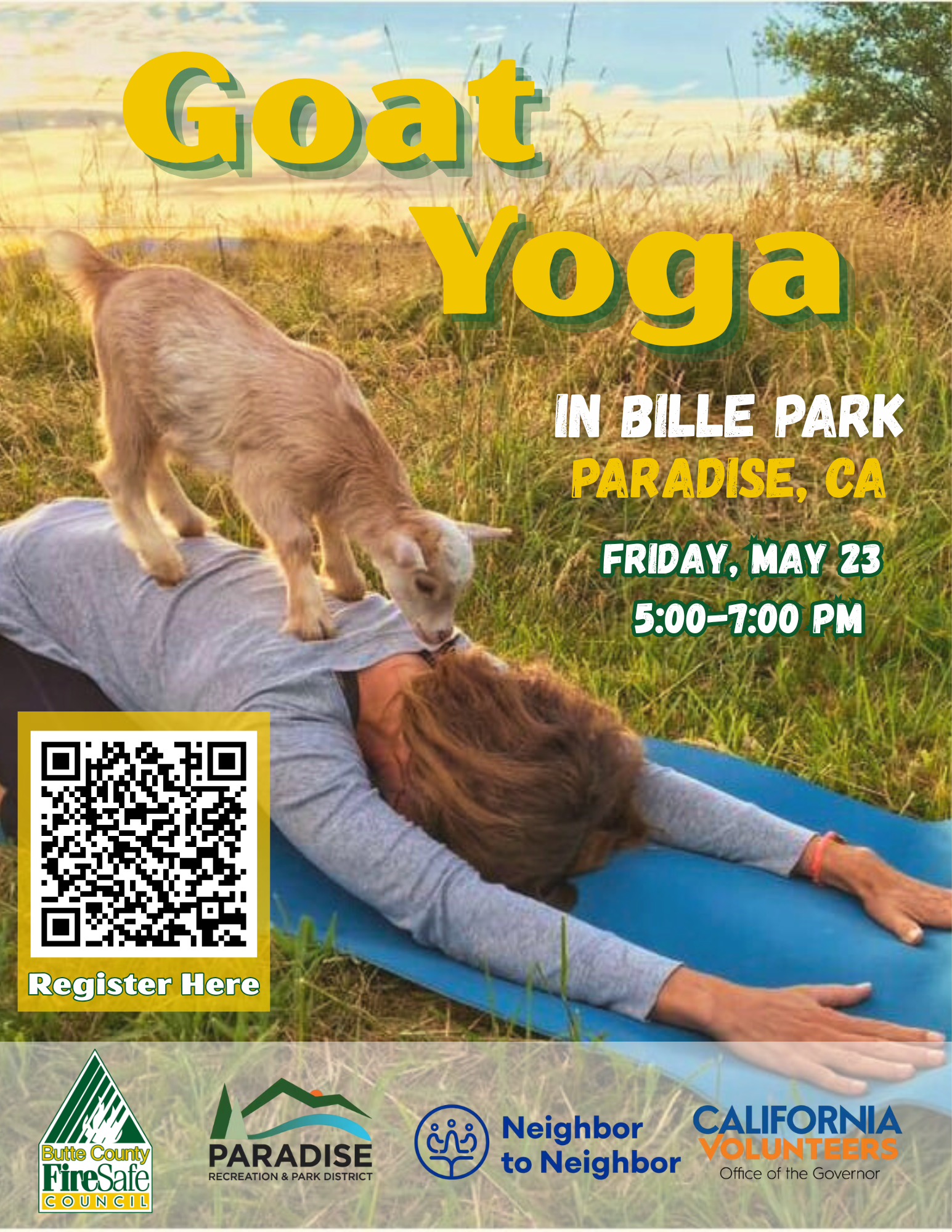Can’t wait for the Paradise Grazing Festival? Get some goat time and a relaxing evening stretch in Bille Park for our first goat yoga pop-up event. Join us for either the 5-6 pm class or the 6-7 pm class, led by goat yoga instructor, Meg Helms! The group will be guided through beginner poses that encourage friendly goat interaction, with a handful of youthful cashmere goats. Meet a neighbor, and a goat at this free Neighbor-to-Neighbor event, hosted by the Butte County Fire Safe Council. Don’t forget to join us for more goat fun at the Paradise Grazing Festival on June 1st!