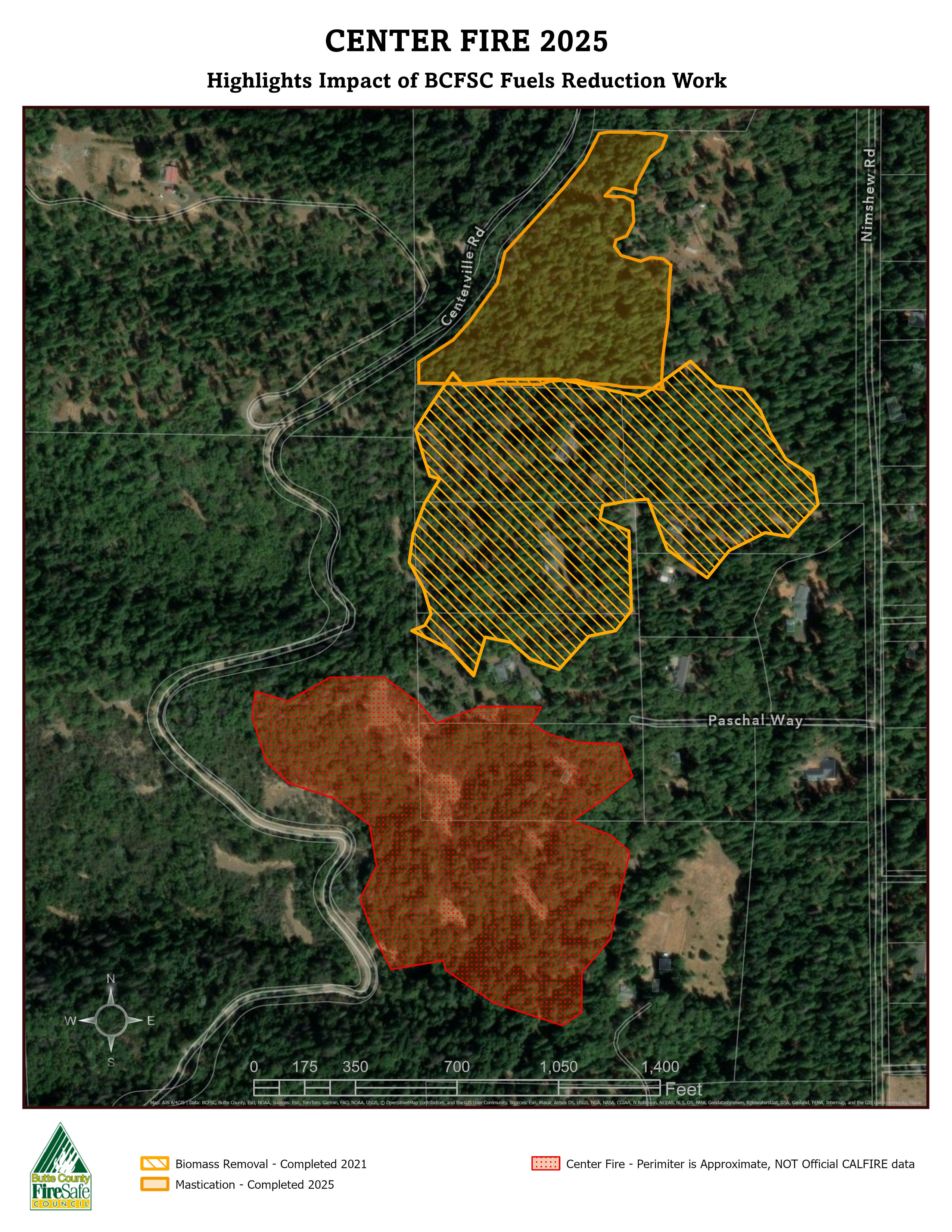 What made this fire particularly significant was its proximity to two Butte County Fire Safe Council forest health projects. To the east, a recently completed mastication project, funded by The Sierra Nevada Conservancy as part of the Magalia Forest and Wildfire Resiliency Project, bordered a 2021 biomass removal project completed under the My Sierra Woods program, funded by the American Forest Foundation. These carefully planned treatments helped slow the fire’s spread, support firefighter response, and reduce ecological impacts.